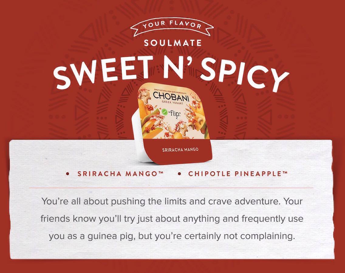 I love yogurt! I especially love Chobani, the creamy goodness of Greek yogurt is so amazing! My daughter has been a he fans of the Chobani Flips with all the fun flavors! In celebration of Chobani Flips, we’re inviting you to flip out and find your flavor soulmate! Craving that late night fix and can’t decide if you’re team sweet or team spicy? Don’t want to choose at all? No worries, they’ve got your back.