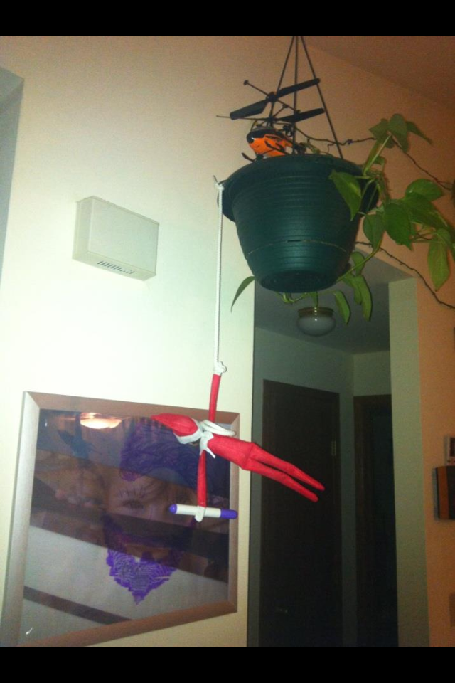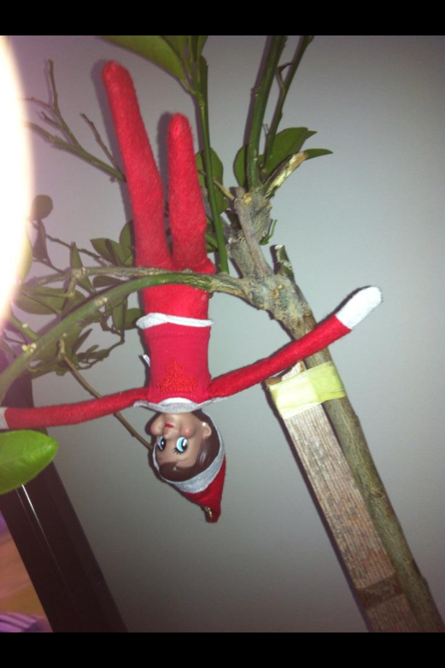 - Elf on the Shelf hangs upside down in a plant.