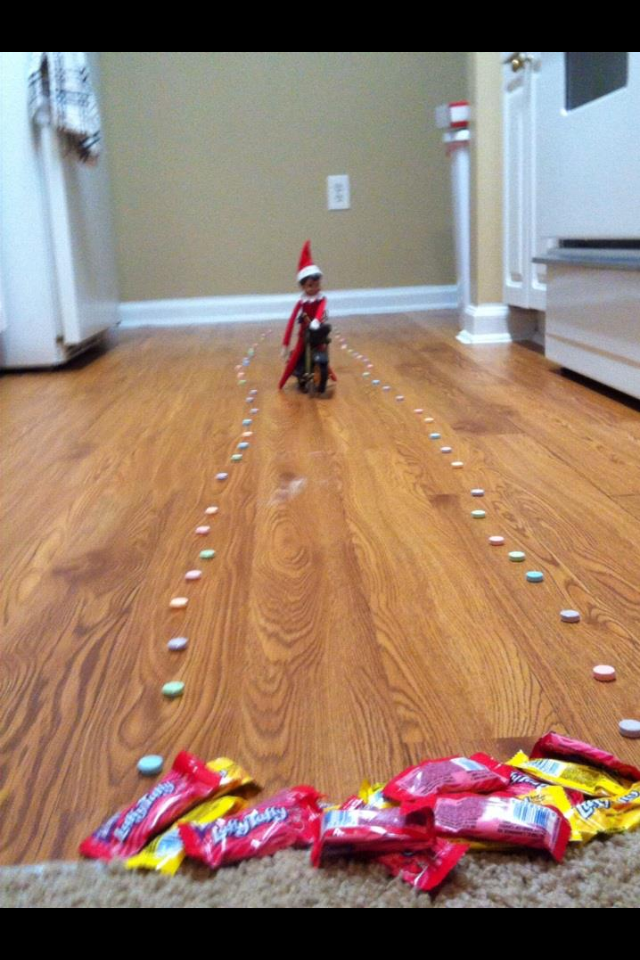 - Elf on the Shelf makes a speedway of candy and rides it!