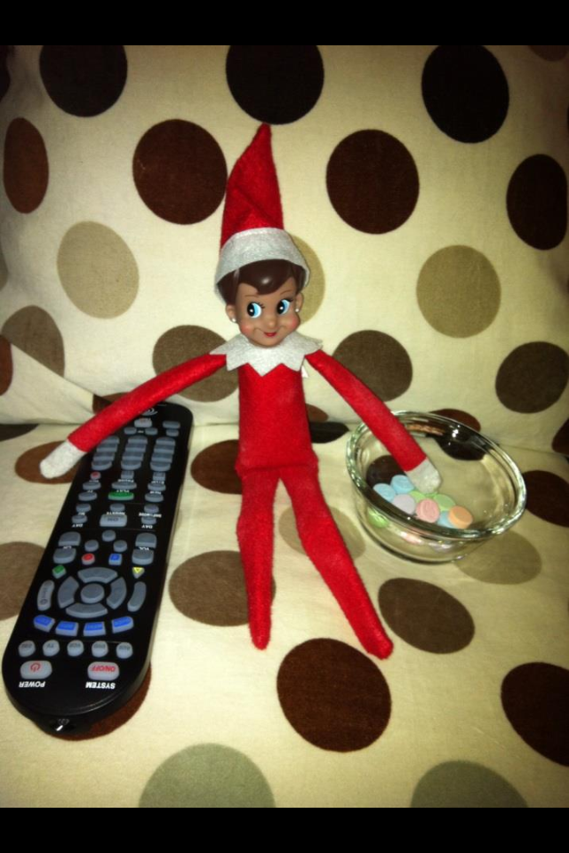 - Elf on the Shelf watches Tv with a candy snack.