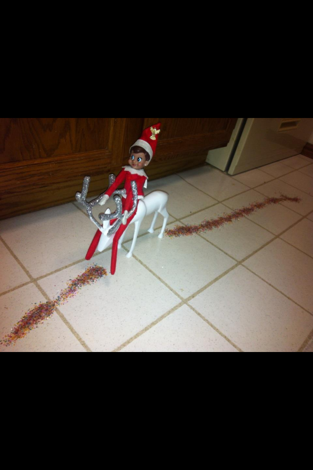 - Elf on the Shelf rides reindeer with sprinkles on floor.