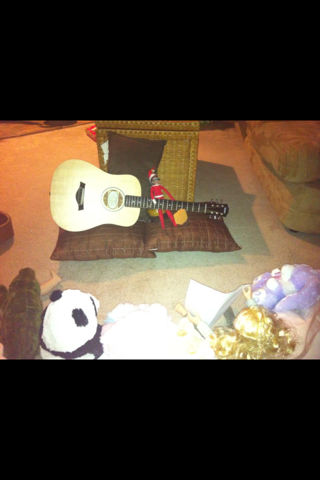 - Elf on the Shelf plays guitar for an audience.