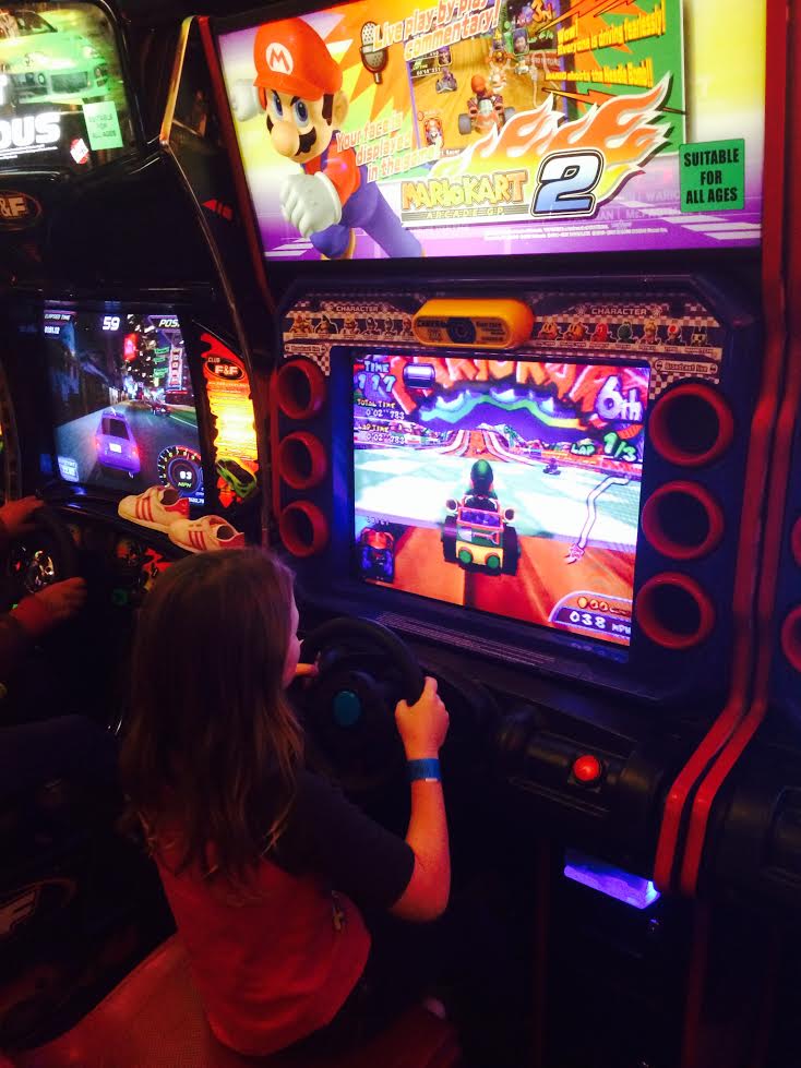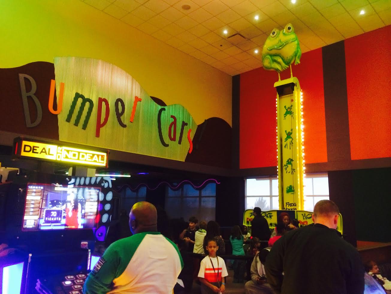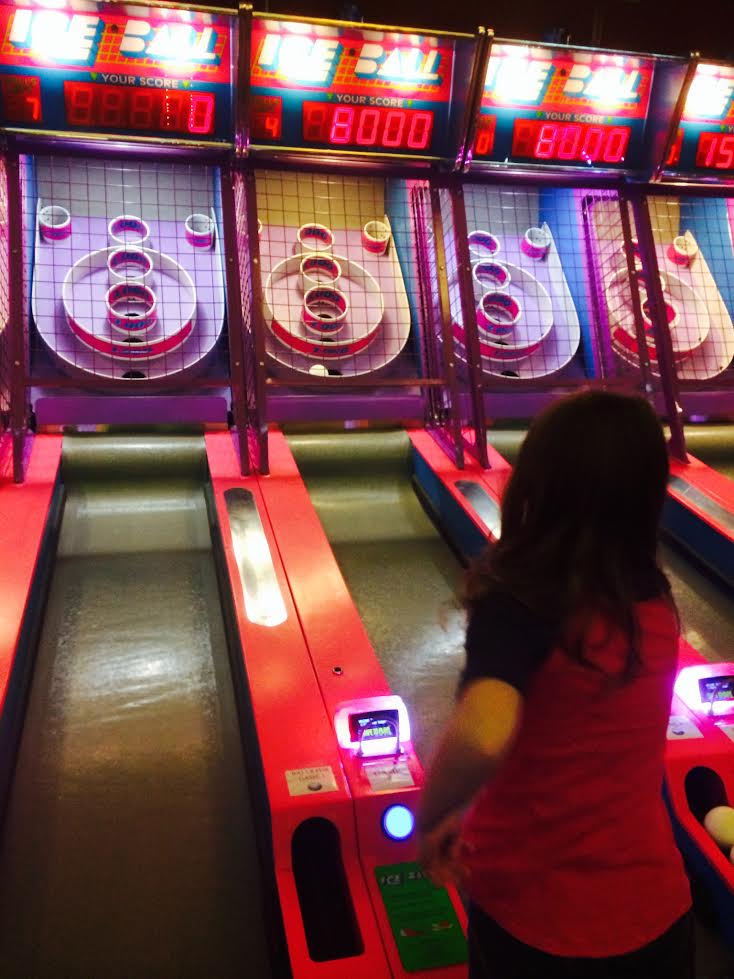 I took my daughter on a Saturday night, we arrived just before 5:00 pm. The line through the doors was about a 15-20 minute wait, very busy! (Which is a good sign that it’s a fun place, right?) We were greeted with a warm and happy welcome. We received our game cards and wristbands. We decided to play first rather than eat right away. You can do whichever you prefer. Once you are through the doors it’s up to you to make your plan. It was hoppin’! We played a lot of games, my personal favorites were the “old-fashioned” ones, such as skee-ball and the Bozo the Clown bucket game! It really was a blast, but there were also a ton of new age games, such as Fruit Ninja. I was familiar with it from an app on my daughter’s iPad. But it was a large version on a touch screen. So neat! There were also several birthday parties going on while we were there, and they looked so planned and exciting. The energy in the whole place was felt, everyone had a smile on their face, parents and kids alike. We tried out the bumper cars, we went bowling, and my daughter loved the BalloCity-it’s a must see.